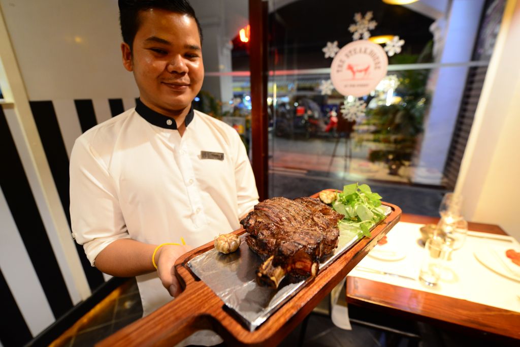 エアコンの効いた、洒落た店内に入り、店員が差し出したメニューを見ると、「マスターカット 1.2㎏」の文字がどーんと中心に。お肉は海外からの輸入だとのこと。ちなみにお値段は「65$」・・・。おー、なかなかシェムリアップのレストランで一皿の値段という意味では見かけない数字だな・・・。