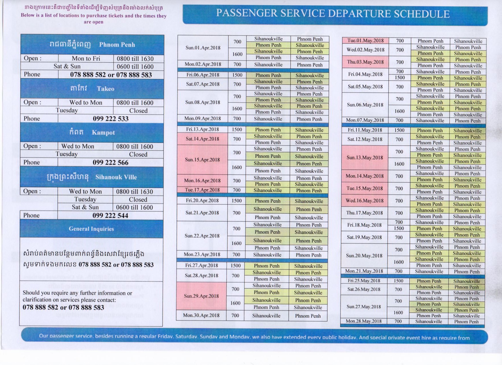 また、スケジュール表には出ていませんが、プノンペン駅~プノンペン空港まで4月某日(未定)より1日3便運航開始とのことですが、まだはっきりと決まっていないとことです。(駅のスタッフに確認しても誰も分からない状態。)
