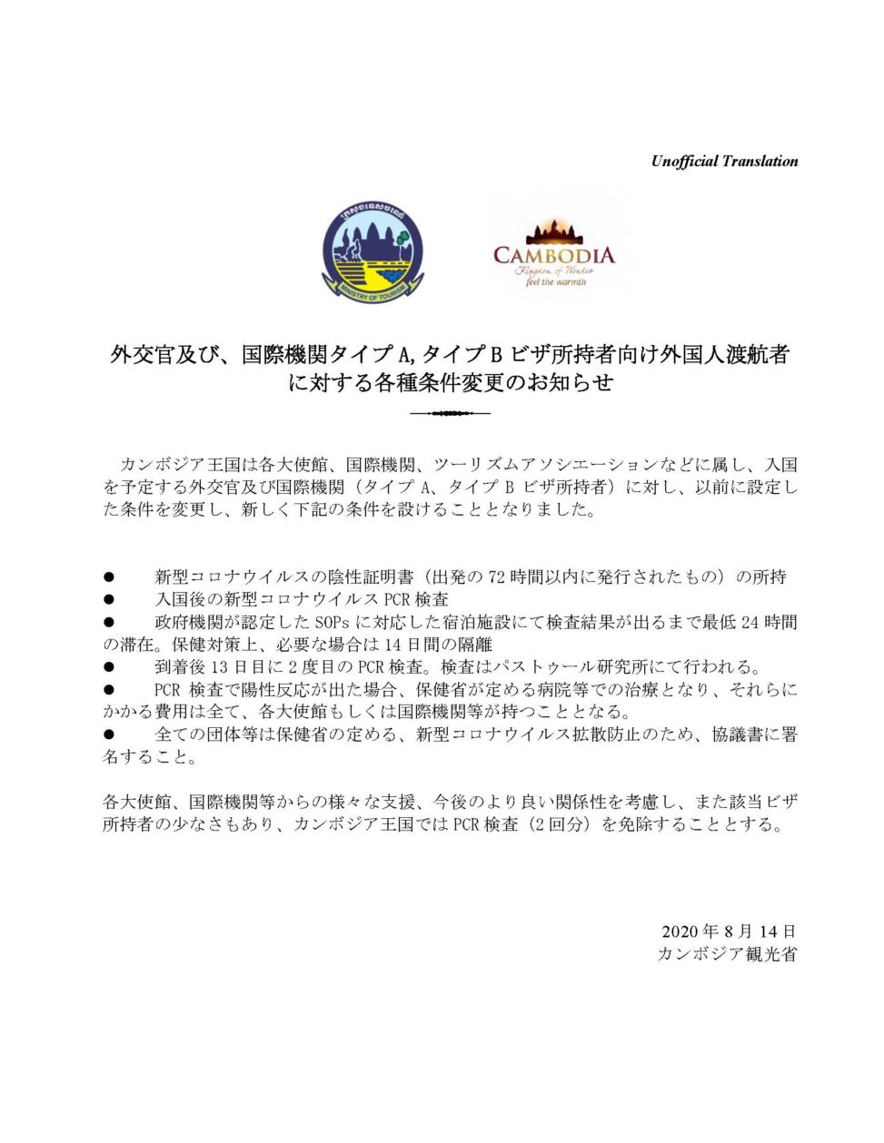 カンボジア王国は各大使館、国際機関、ツーリズムアソシエーションなどに属し、入国を予定する外交官及び国際機関(タイプA、タイプBビザ所持者)に対し、以前に設定した条件を変更し、新しく下記の条件を設けることとなりました。