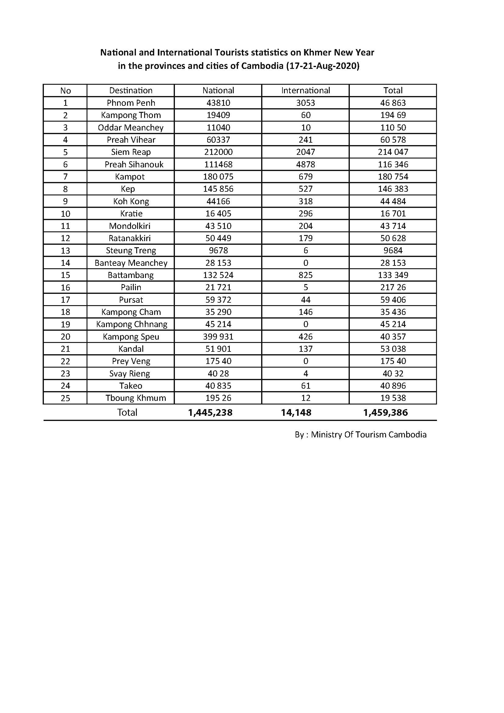 カンボジア各地の観光局の発表を取りまとめた観光省の観光レポートによると、2020年8月17日~21日の5日間で1,459,386人が旅行し、内1,445,238人がカンボジア人旅行者であり、14,148人が外国人旅行者(国内在住外国人)であった。
