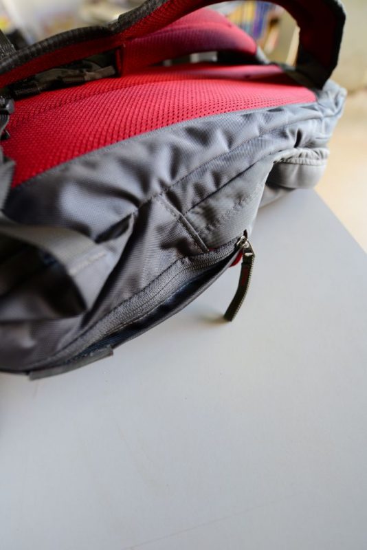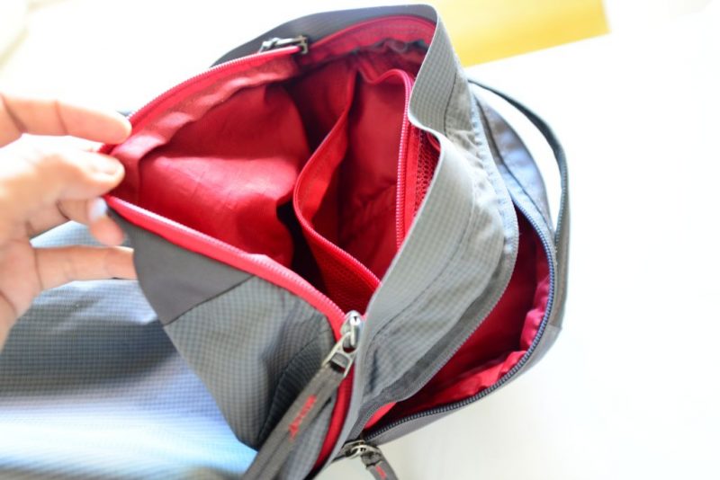 まずはジッパーですが、通常の荷物入れ用のほかに、背中とぴったり沿うようにパソコンやA4書類がちょうど入る薄さの入れ口があります。で、通常の荷物入れのほうにはペンやパスポート、スペアバッテリーなどがすぐに取り出せる小さなポケット完備。一眼レフもサクッと取り出せるし、パソコンも空港のX線検査時にサクッと取り出せます。