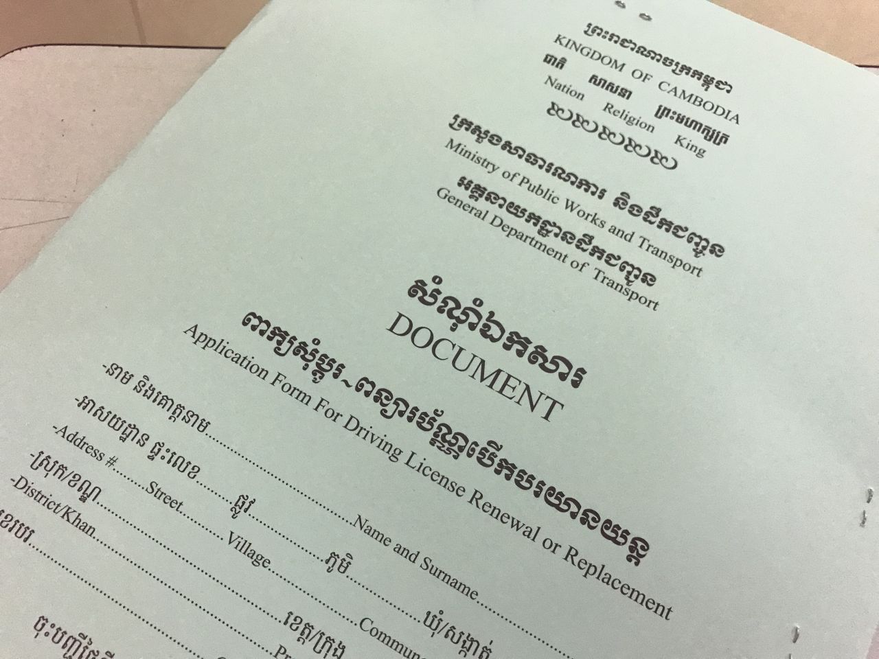 それまではシェムリアップなどの地方都市でもプノンペンでも、近くのドライビングスクールに必要書類をもっていけば代行申請(35~50$程度)ができていたのですが、それらが一切不可となりました。
