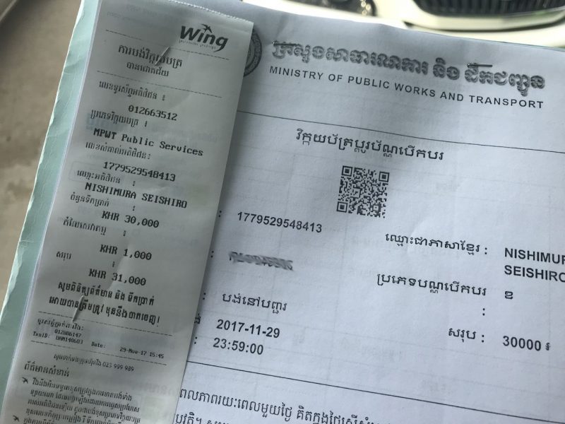 - 41000リエル(30000リエルは免許発行費、1000リエルは振込手数料・ウイング利用、10000リエルは健康診断料)