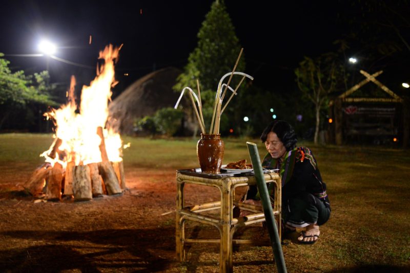 プノン族の女性が土地神にお祈りを捧げ、地元のお酒を楽しみます。