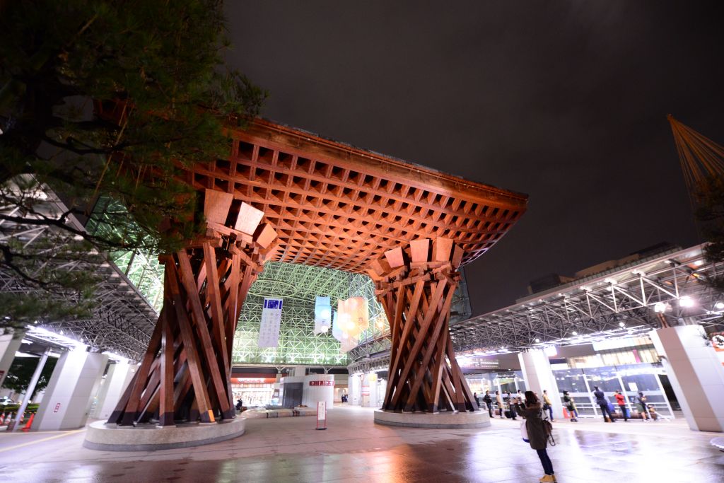 夜: 駅の待合室でどこに行くか決める。先に電車が着たほうにしようと思い、結果、金沢に向かうことになった。北陸新幹線に乗り、金沢駅に到着。