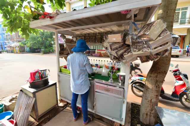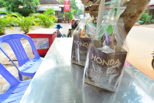 道路に完全に面しているテイクアウト用コーヒー屋があり、車やバイクに乗ったまま、声をかけると、2分くらいで出来立てコーヒー(1杯3000リエル、約80円)を渡してくれます。いや正確に言うとコーヒーだけでなく、ストロベリーや各種フルーツドリンクもです。
