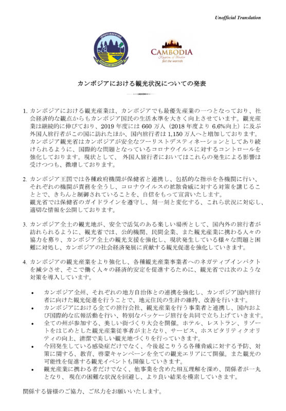 - カンボジア王国では各種政府機関が保健省と連携し、包括的な指示を各機関に行い、それぞれの機関が責務を全うし、コロナウイルスの拡散脅威に対する対策を講じることとで、きちんと制御されていることを、自信をもって宣言いたします。観光省では保健省のガイドラインを遵守し、刻一刻と変化する、これら状況に対応し、適切な情報を公開しております。