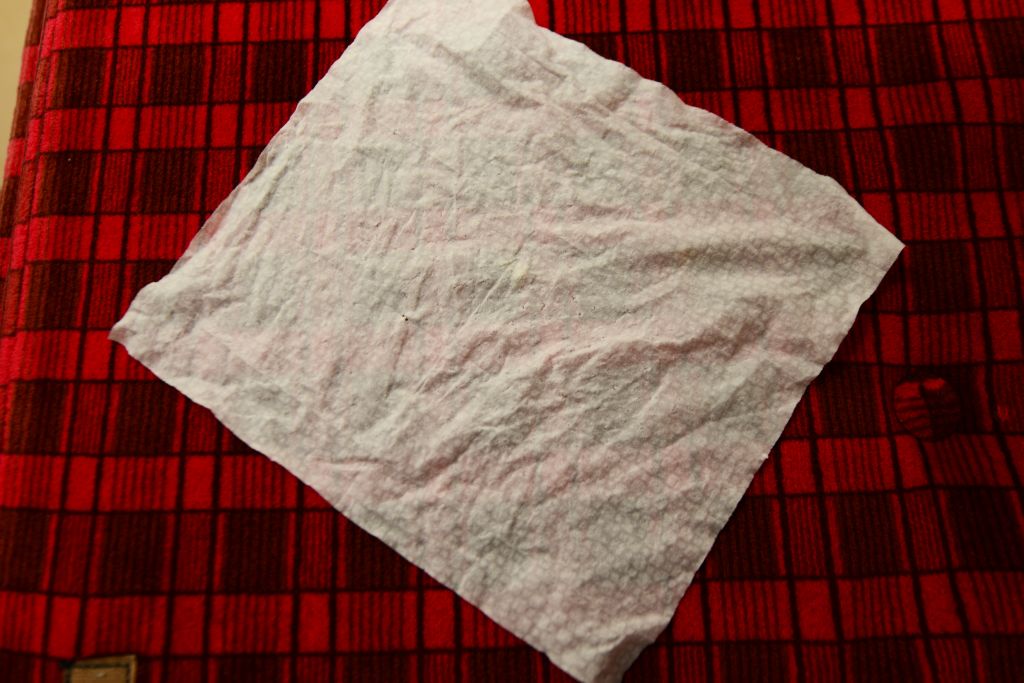 そんな時に役に立つのがこちら、飛行機やコンビニでもらえるウェットティッシュ。小さいですが、結構強度も強くて、体をふきふきして、ぎゅっと絞って乾燥させればOK。一枚で数回普通に使えます。