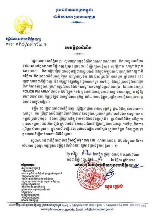 2019年11月5日、プノンペン市より通達があり、独立記…