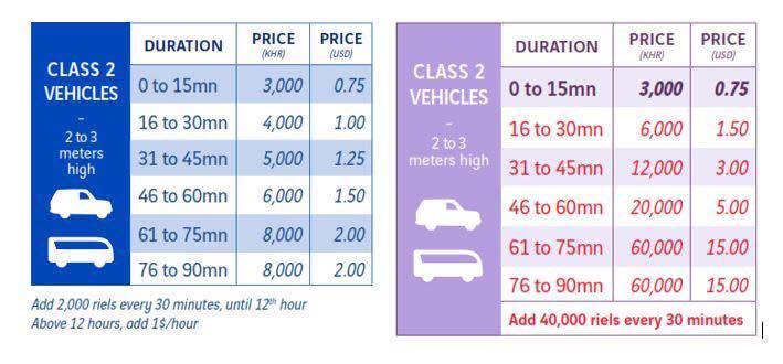 | 12時間以内 | 30分ごとに2,000 リエル追加 | 30分ごとに40,000 リエル追加 |