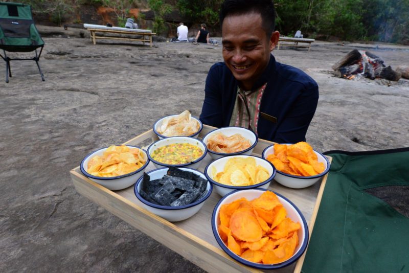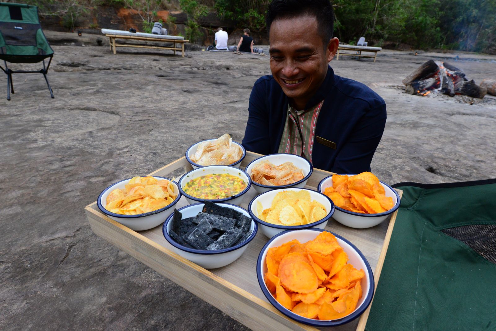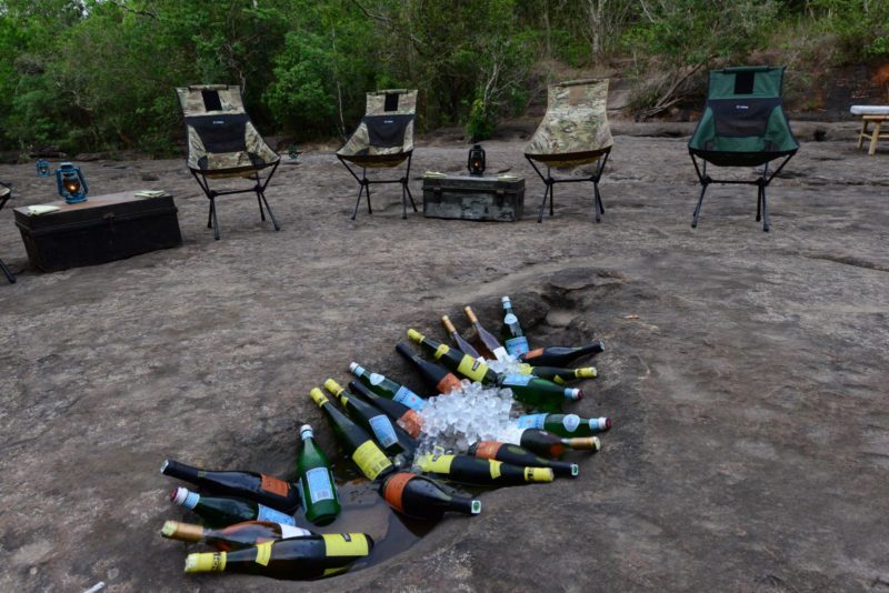 15分程走ったところに川があり、そこに滞在中のお客様で、参加希望の人が集まります。基本全て無料です。ちなみにエリア、雨季は川となり深さ1メートル以上になるそうですが、乾季なので川底の岩の上でパーティーとなります。