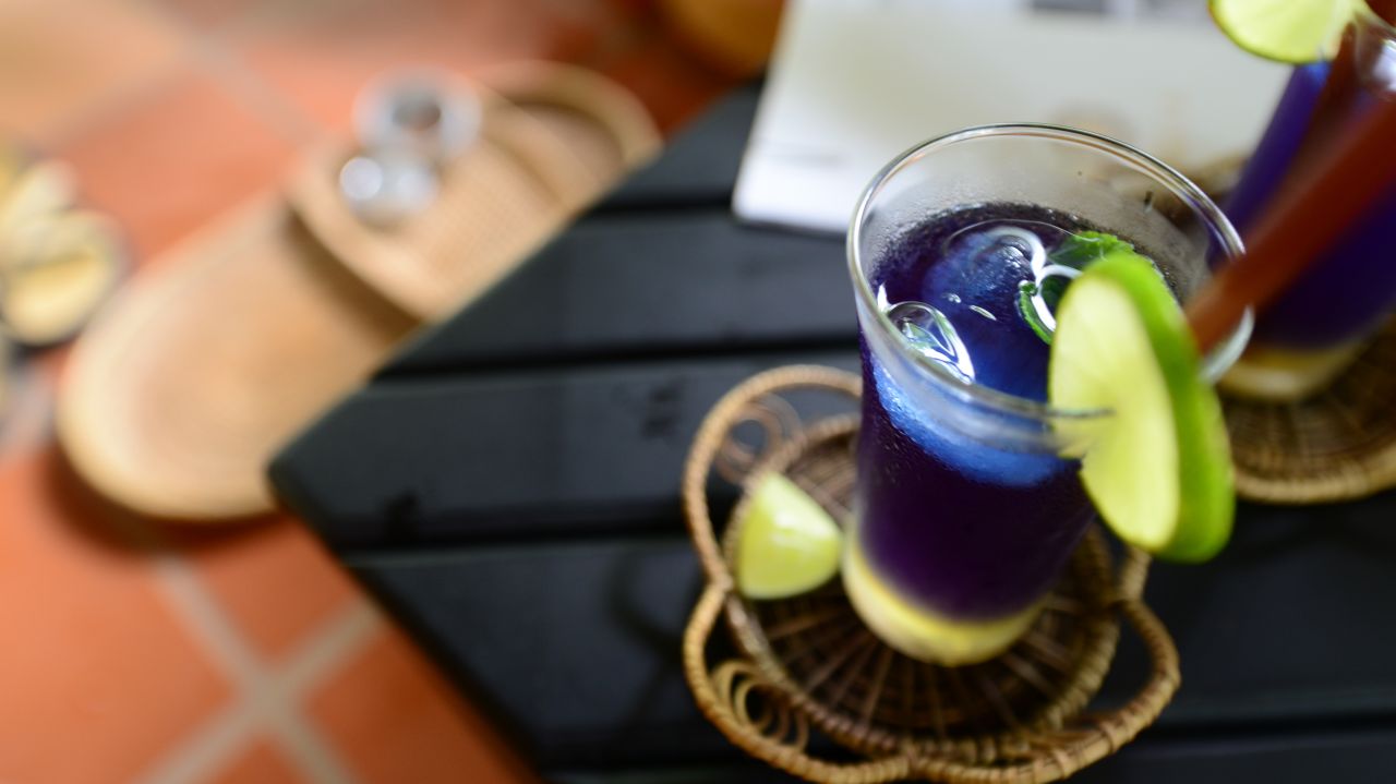 そして、再びハーブティーが。このコースだけのオリジナルティーだそうで、ライムを入れると青から紫に色が変わっていきます。