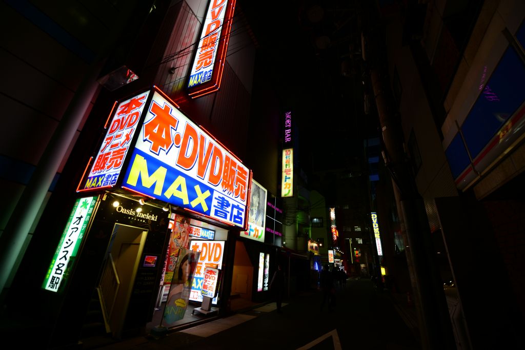 ちなみに、少しだけ裏道にあるので、夜になるとすぐ近くにはこんな店舗も。「モトカノ」というお店が気になる。