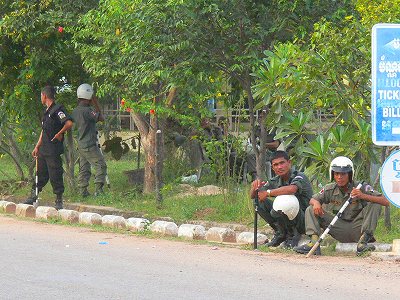 午前中からアンコールワット近くに続々と集結し最終的には1000人を超すタクシードライバーがデモを行いました。アンコールワットのチケット売り場近くでは銃を持った兵隊や警官が厳重封鎖していたのですが、調子に乗ったデモ隊はアンコールワットに向かい近くに停めてあった電動自動車を破壊しました。