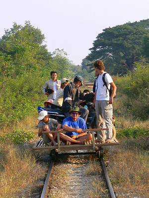 このトップ飾る④番ですが、カンボジアらしく本当に勝手で適当!! 廃線した1本しかない鉄道線路に地元の人が手作りの竹製電車を時速30km位で走らせており、正面から他の竹製電車が来ると荷物が少ないほうが”どっこらしょ。めんどくせえなー。この野郎ー。”ってな感じで自分の乗っている電車を持ち上げ脇にどかして、相手が通り過ぎるのひたすら待つ。ただそれだけ。カンボジア人をかなり身近に体験できるものです。是非ご体験あれ。