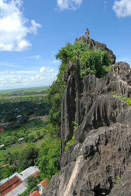 場所はシェムリアップから約2時間30分ほどタイ側に向かったところの町シソポンの大岩「プノンチンチェン」です。