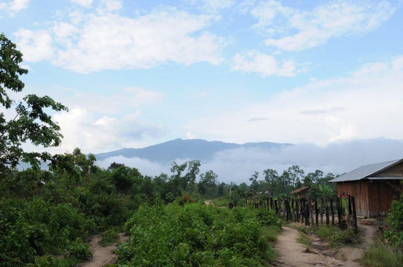 そのまま、さらに麓近くの小さい村スラエコンバイに向かう(この道が悪路・約1時間・バイクタクシーで往復20$×人数+レンジャーの分も出す必要あり)と途中からアオラル山が見えてくる。